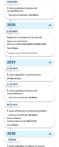 Il report consente di verificare i titoli attribuiti al veicolo, inclusi i chilometraggi registrati e le voci relative alla proprietà. È inoltre possibile accedere a informazioni su danni totali segnalati, report da centri di demolizione, cronologia degli incidenti e casi registrati di furto del veicolo. Un'aggiunta interessante al report: offriamo accesso alle offerte di vendita archiviate del veicolo negli USA.